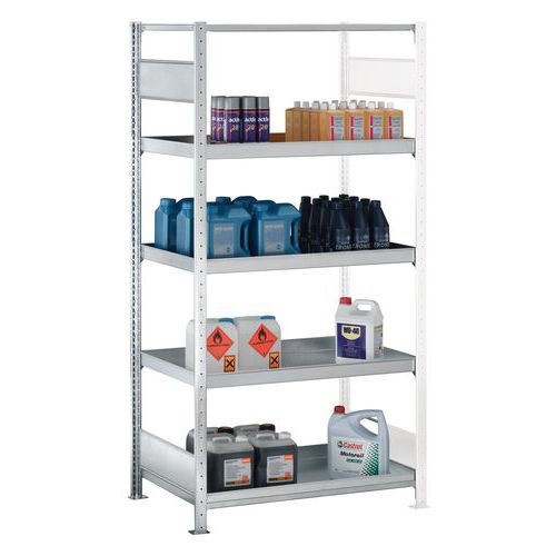 Stelling met opvangbakken met waterdichte legborden.