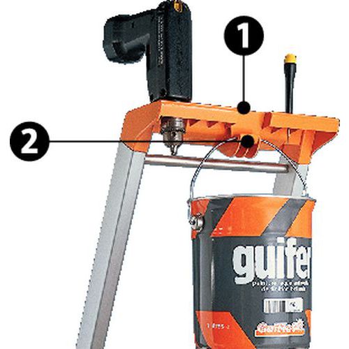 Geanodiseerde staanders zodat de handen tijdens het werk schoon blijven. Verstevigde antislipvoetensteun van 280 x 250 mm. Koppeling tussen staanders en treden met een technisch uiteinde, dat rotatie tegenhoudt. Aluminium scharnieren gemonteerd op polyamide onderdeel (geen risico op vastlopen). De poten van de staanders zijn wijd uitlopend voor meer stabiliteit. Treden met een breedte van 90 mm. Zeer veilige laddervoeten. Reling met kantelbeveiliging aan de voorzijde: hoogte 656 mm. Product geproduceerd in Frankrijk.