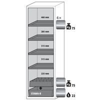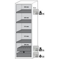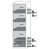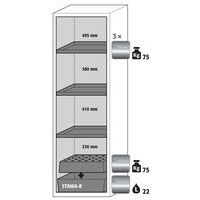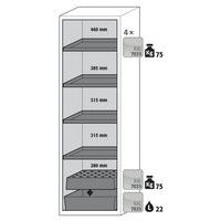 Veilige opslag, voldoet aan de geldende regelgeving voor gevaarlijke, ontvlambare producten in werkruimtes Robuust en duurzaam: stevige constructie aan de buitenzijde van brandwerende platen met een coating van melaminehars 3 bevestigingsscharnieren per deur Volledig sluitmechanisme en beveiligingselementen ter bescherming tegen corrosie, gemonteerd buiten de opslagruimte Gecontroleerd gebruik: vergrendelbare deur, compatibel met centrale vergrendeling Eenvoudig te installeren: verstelbare poten Beluchting en ontluchting: ingebouwd beluchtings- en ventilatiesysteem voor aansluiting (diameter 75 mm) op een technisch luchtafvoersysteem Gemaakt in Duitsland