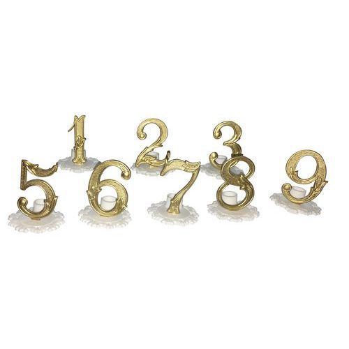 Witte kaars gemonteerd op een witte kunststof houder waarop een gouden cijfer is bevestigd.
