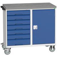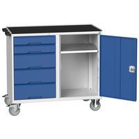 Constructie van gelast plaatstaal Het vak met deur is uitgerust met een legbord van gegalvaniseerd staal, in hoogte verstelbaar Draagvermogen per legbord 60 kg Laden kunnen 100% geopend worden, belasting 50 kg Beveiligingsmechanisme dat ervoor zorgt dat de laden niet per ongeluk opengaan. Handgreep 4 wielen met een diameter van 125 mm, 2 bokwielen en 2 zwenkwielen met rem Maximaal toelaatbare belasting 200 kg Breedte 1050 mm Hoogte 980 mm, diepte 600 mm met tafelblad dikte 30 mm Hoogte 965 mm, diepte 550 mm met bovenkant met 3 opstaande randen Gemaakt in het UK Max. belasting (kg) : 300