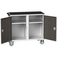 Constructie van gelast plaatstaal Het vak met deur is uitgerust met een legbord van gegalvaniseerd staal, in hoogte verstelbaar Draagvermogen per legbord 60 kg Laden kunnen 100% geopend worden, belasting 50 kg Beveiligingsmechanisme dat ervoor zorgt dat de laden niet per ongeluk opengaan. Handgreep 4 wielen met een diameter van 125 mm, 2 bokwielen en 2 zwenkwielen met rem Maximaal toelaatbare belasting 200 kg Breedte 1050 mm Hoogte 980 mm, diepte 600 mm met tafelblad dikte 30 mm Hoogte 965 mm, diepte 550 mm met bovenkant met 3 opstaande randen