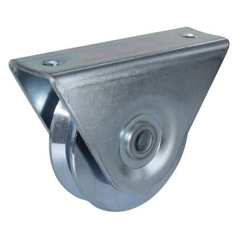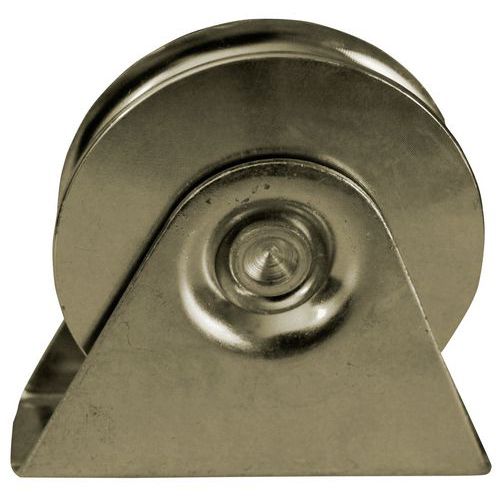 - Wiel van verzinkt staal met V-groef en externe houder voor optimale geleiding.